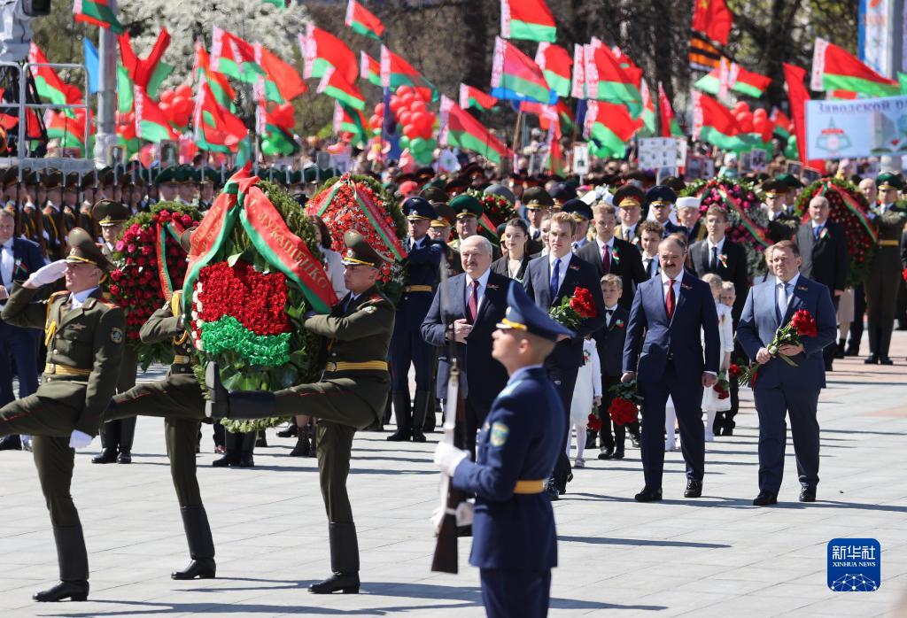 5月9日,在白俄罗斯明斯克,白俄罗斯总统卢卡申科(中)向胜利纪念碑献花。