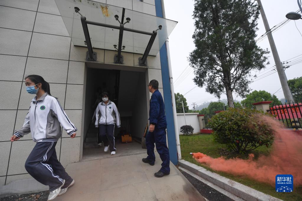 5月10日,昌化中学的学生在杭州市临安区昌化消防中队的训练楼里进行逃生应急演练。