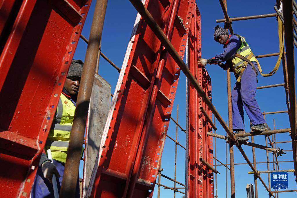 5月9日,在纳米比亚首都温得和克,工人在首都国际机场公路项目第三期工程施工现场工作。