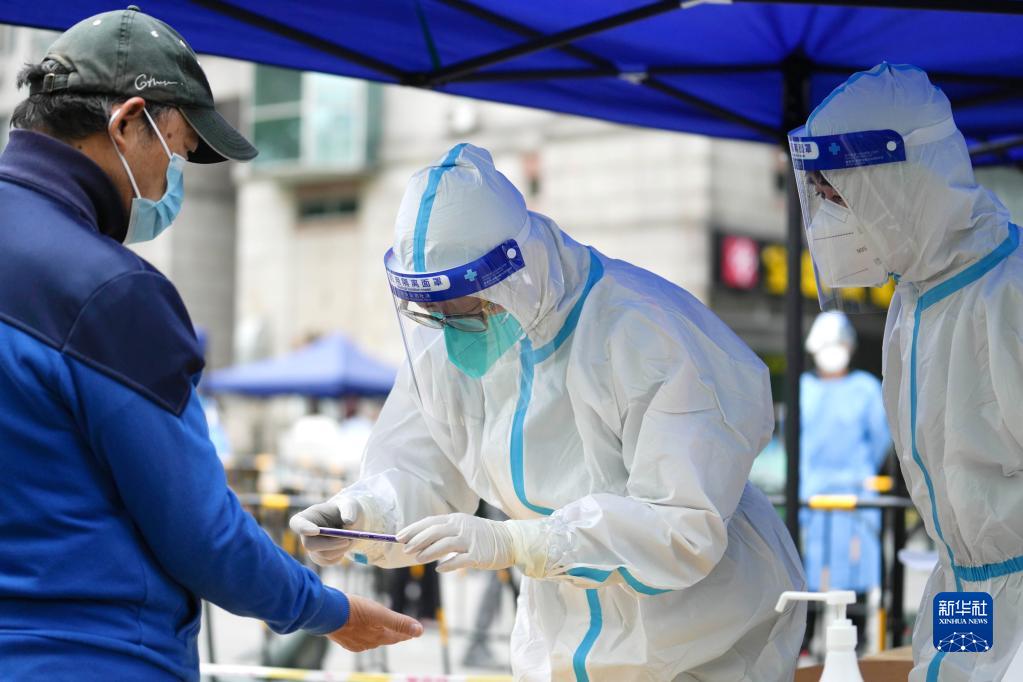 在北京市朝阳区八里庄街道一处核酸检测点,来自北京一家纺织集团有限公司的志愿者、在职党员白一江(中)和来自链家的一位志愿者(右一)在为一位检测者登记身份信息(5月8日摄)。
