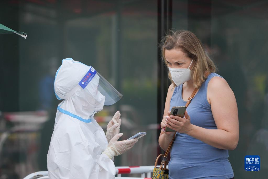 在北京市朝阳区建外街道一处核酸检测点,一位志愿者(左)为外籍人士核对身份信息(5月5日摄)。