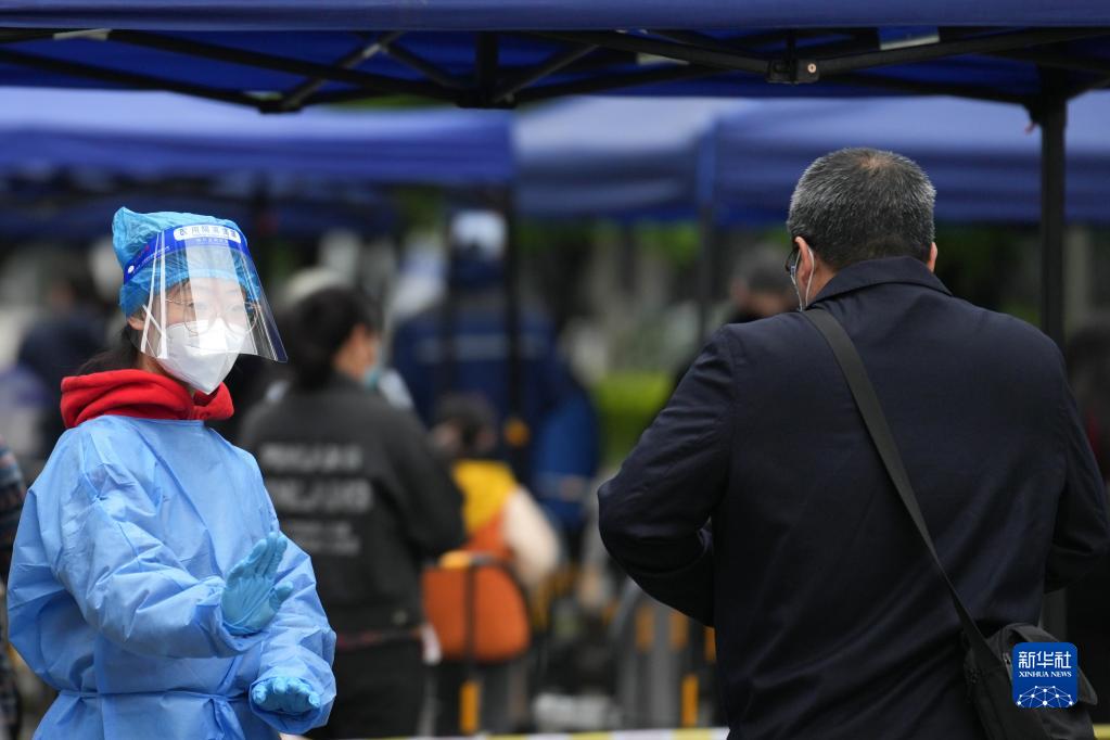 在北京市朝阳区八里庄街道一处核酸检测点,来自北京一家传媒文化有限公司的志愿者张书琪(左)在引导参加核酸检测的人员有序排队(5月8日摄)。张书琪今年25岁,这是她第一次参加疫情防控志愿工作。
