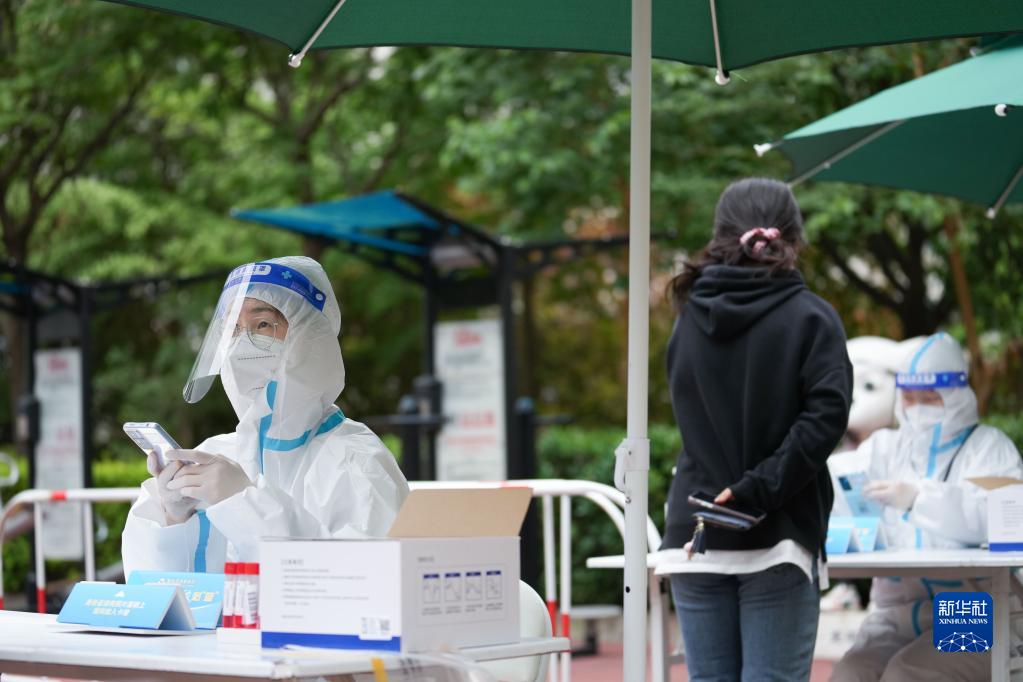在北京市朝阳区建外街道北郎社区一处核酸检测点,来自北京一家律师事务所的志愿者张旭(左一)在为一位检测者登记身份信息(5月9日摄)。张旭出生于1998年,是一名共青团员,这是她第六次参与疫情防控志愿服务。