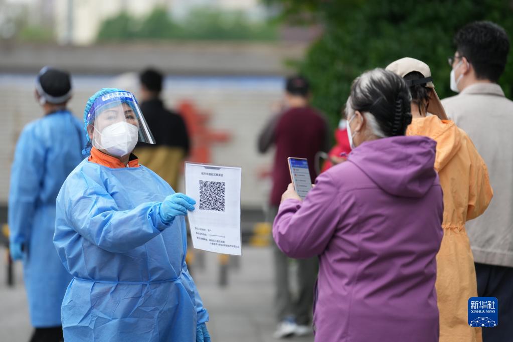 在北京市朝阳区八里庄街道一处核酸检测点,62岁的退休党员志愿者李素荣在引导参加核酸检测的人员扫码登记(5月8日摄)。李素荣在社区的微信群中报名加入了疫情防控志愿工作,“需要人,咱就过来呗!”。