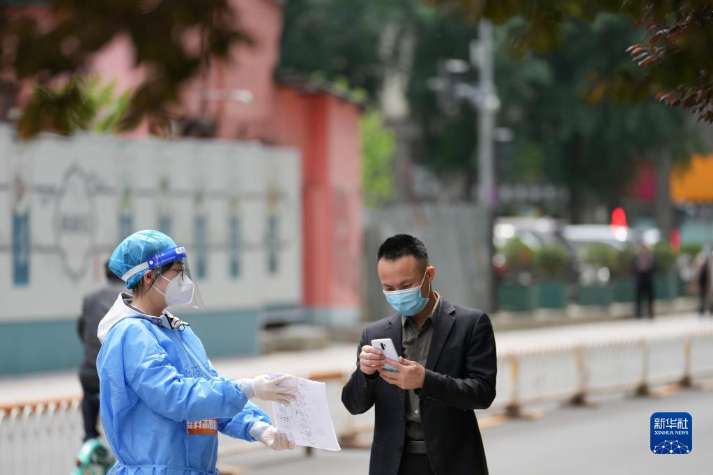 在北京市朝阳区建外街道北郎社区一处核酸检测点,“00”后志愿者陈祺曜(左)在协助检测者扫码登记(5月9日摄)。陈祺曜出生于2000年,即将从北京第二外国语学院毕业,是一名党员,这是她第五次参与社区疫情防控志愿服务。信息录入、核酸检测登记等工作陈祺曜都做过,“几天下来,感觉医护人员很辛苦,希望大家互相理解配合,共克时艰。”