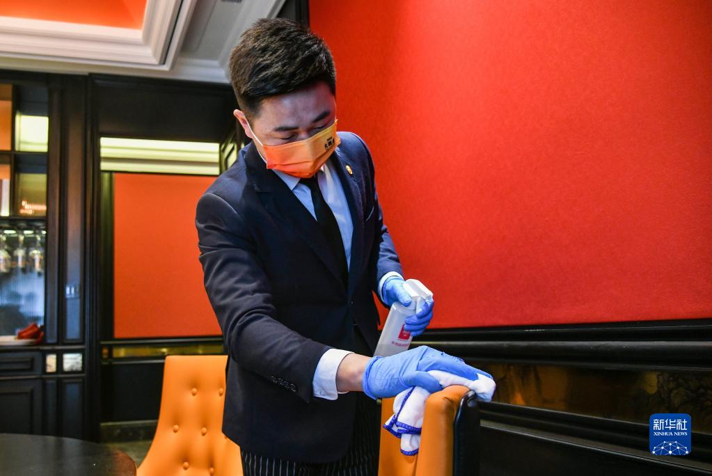 5月10日,服务员在济南一家餐厅内消毒。