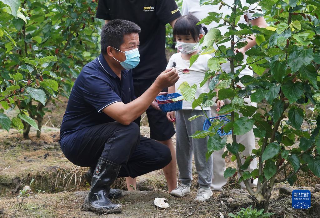 在南昌市湾里管理局梅岭镇的桑葚园里,黄正荣给小游客讲解采摘桑葚方法(5月9日摄)。