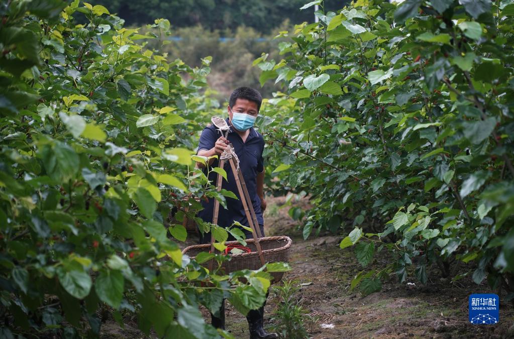 在南昌市湾里管理局梅岭镇的桑葚园里,黄正荣在挑运桑葚(5月9日摄)。