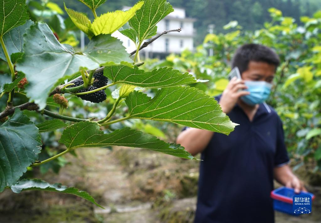 在南昌市湾里管理局梅岭镇的桑葚园里,黄正荣打电话联系销售业务(5月9日摄)。