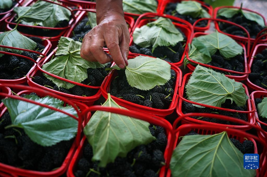 黄正荣将桑叶盖在采摘的桑葚上保湿保鲜(5月9日摄)。
