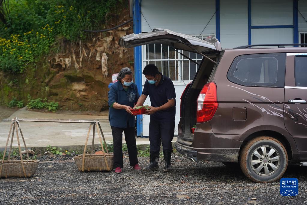 黄正荣(右)将采摘的桑葚装车前往山下的销售点(5月9日摄)。
