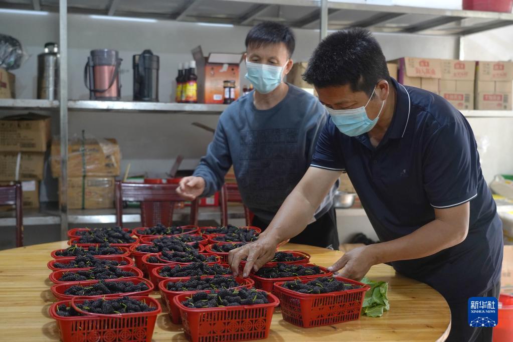 黄正荣(右)把桑葚运送到湾里管理局的一处单位食堂(5月9日摄)。