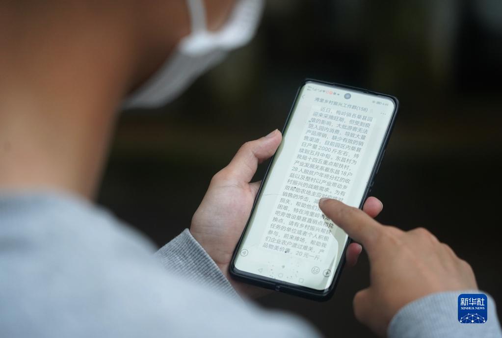湾里管理局梅岭镇的工作人员用手机转发解决桑葚滞销问题的倡议书(5月9日摄)。