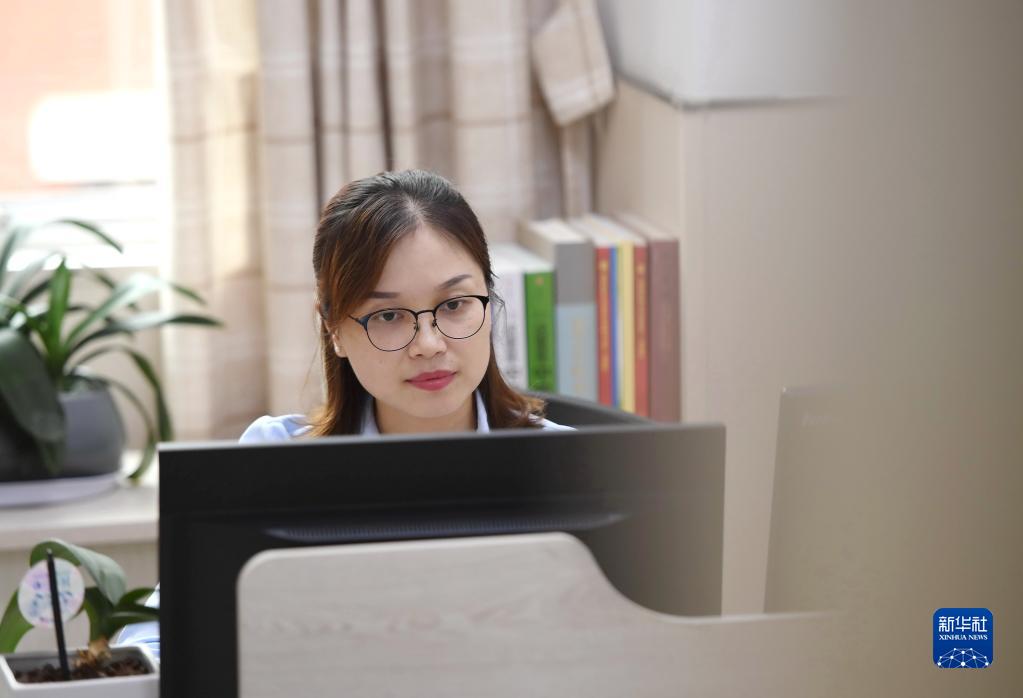 在办公室工作中的谢宝缘(5月10日摄)。
