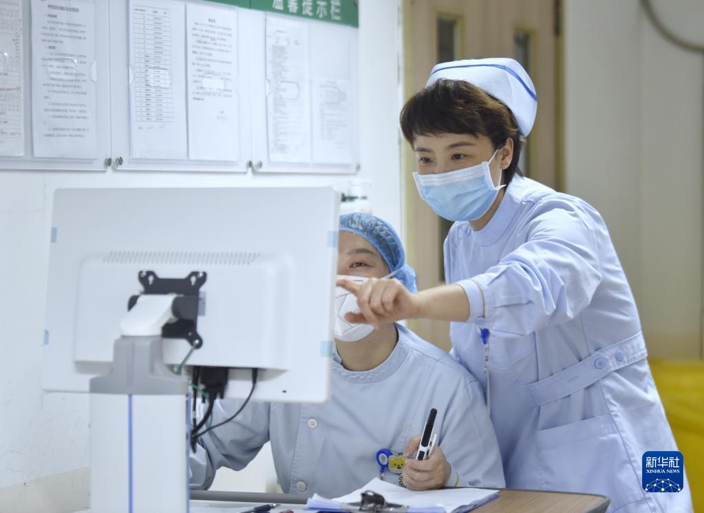 5月9日,冯静(右)与同事一起查看危重症患者的护理记录。