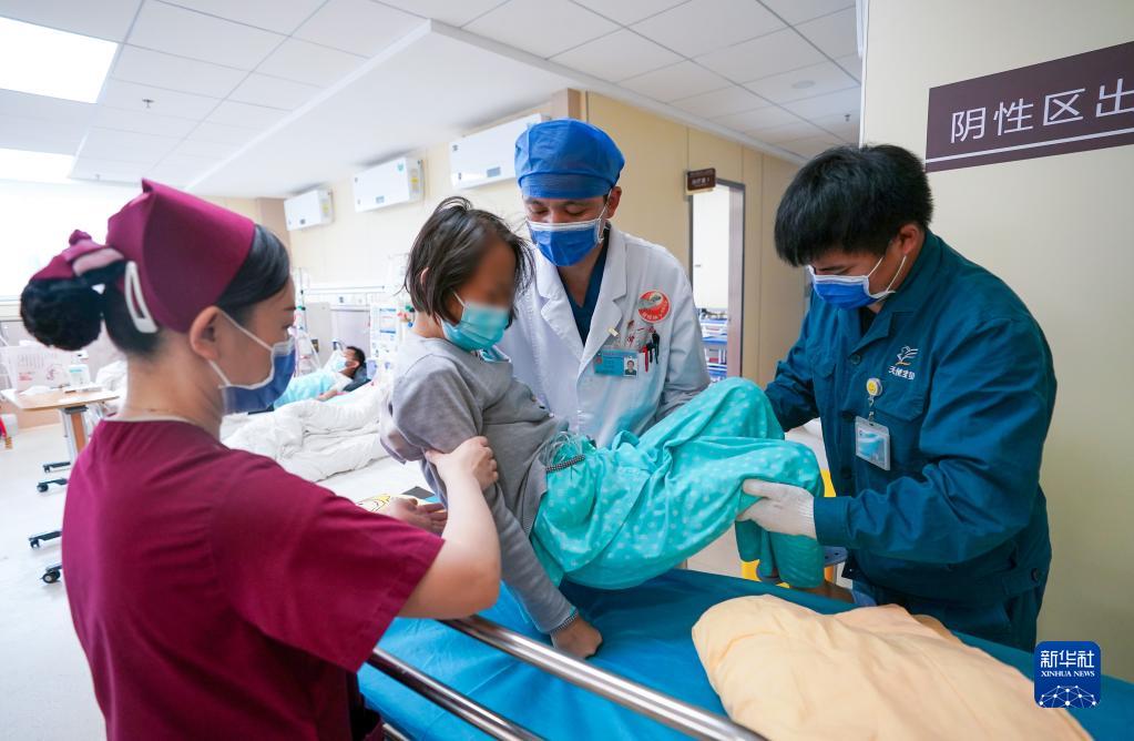 5月10日,赵健华(右二)和同事在帮助一名结束血液透析治疗的患者转移。