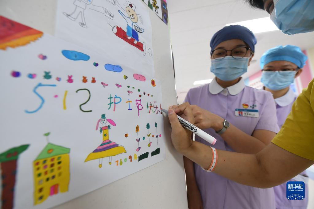 5月10日,一名儿童患者在绘制护士节主题的画作送给谢宝缘和护士们。