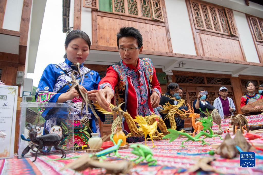 5月11日,在金铃乡民俗风情街,村民在展示传统手工艺。