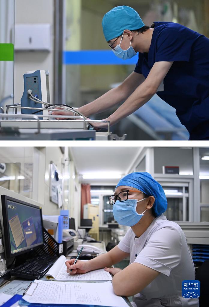 拼版照片:上图是陈岩在天津市第一中心医院肾内血透室调试机器(5月9日摄);下图是吴桐在天津市第一中心医院产科整理病历(5月10日摄)。