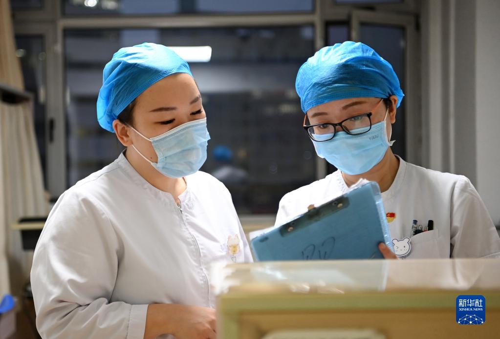 吴桐(右)在天津市第一中心医院产科和同事交流(5月10日摄)。