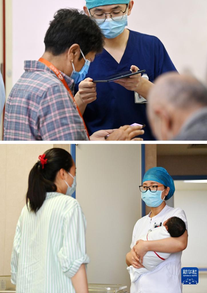 拼版照片:上图是陈岩在天津市第一中心医院肾内血透室对患者进行流调工作(5月9日摄);下图是吴桐在天津市第一中心医院产科怀抱新生儿(5月10日摄)。