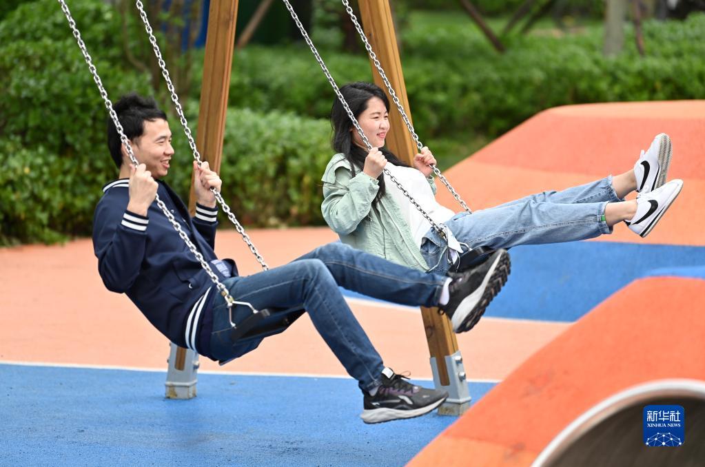 陈岩(左)和吴桐在天津市西青区精武镇的小区内荡秋千放松休闲(5月8日摄)。