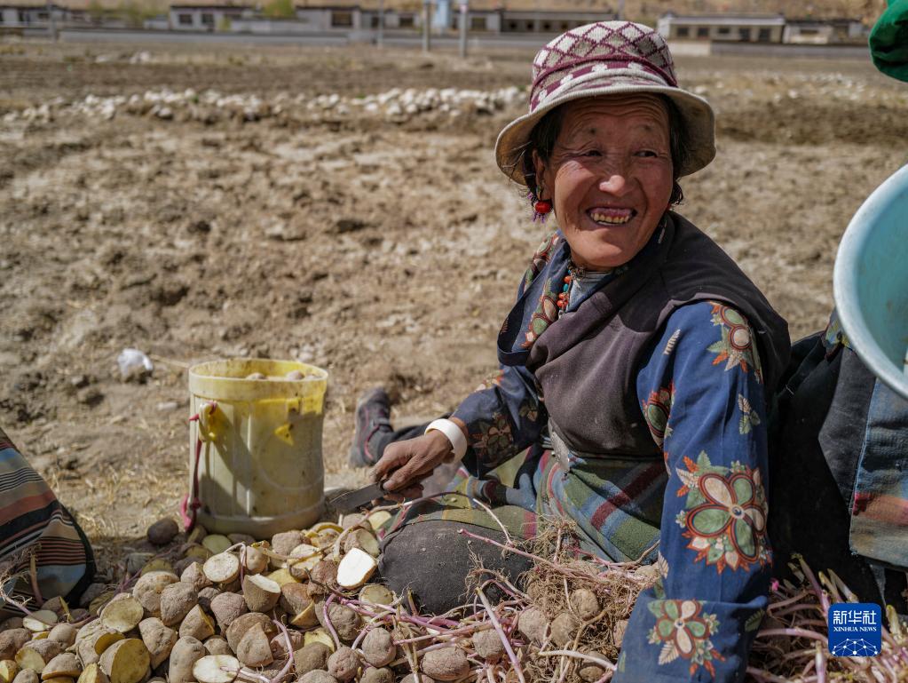 西藏定日县扎西宗乡日白拉新村的村民在劳作(5月10日摄)。