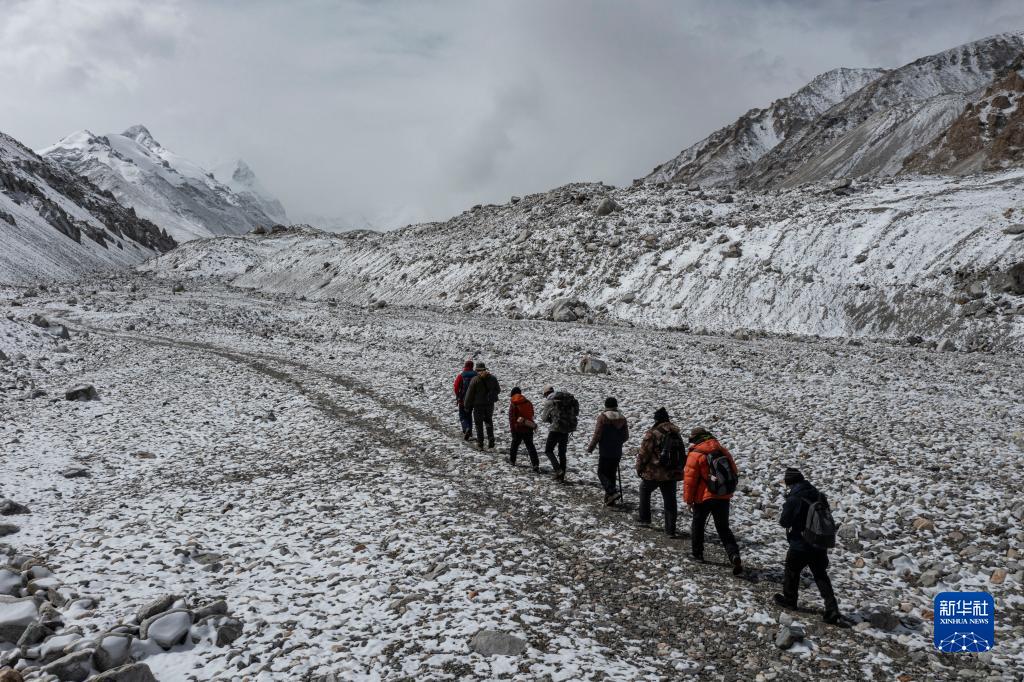 冰川与污染物小组出发前往东绒布冰川区域(5月1日摄,无人机照片)。