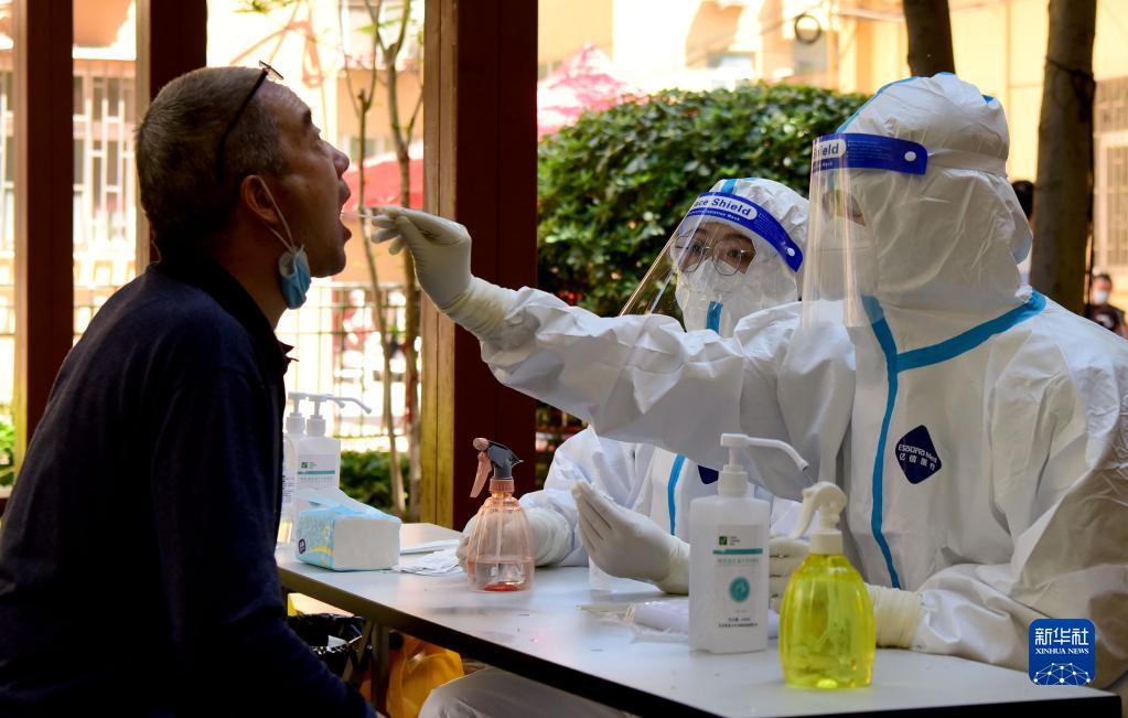 5月4日,在郑州市金水区花园路一小区内,医务人员为居民进行核酸采样。
