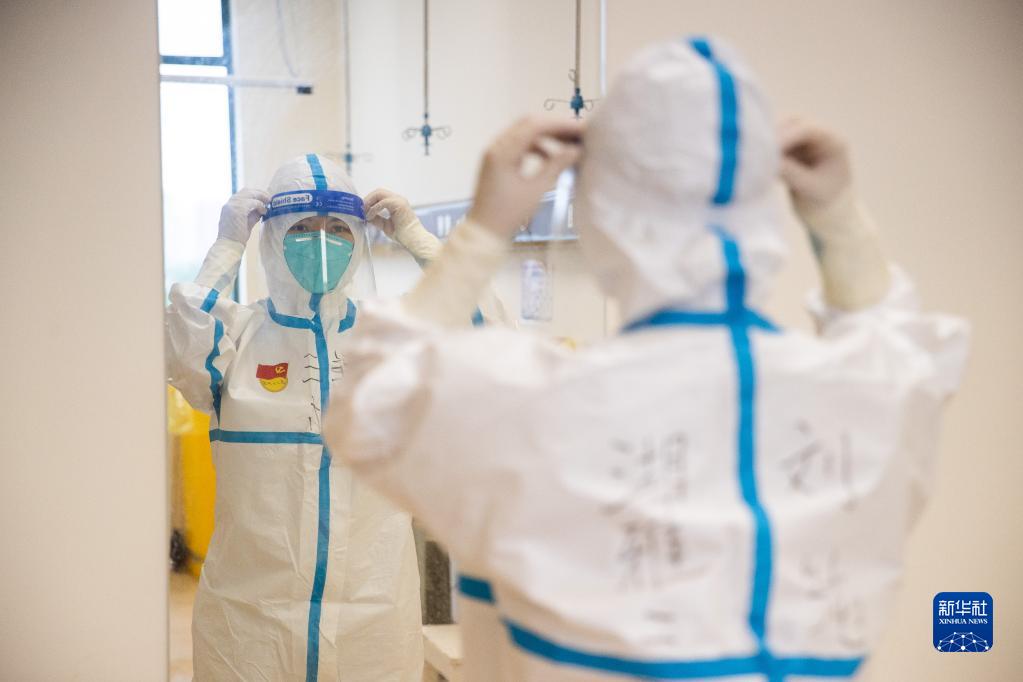 5月10日,在上海市黄浦区瑞金医院卢湾分院重症病房更衣室,刘纯在穿戴防护装备。