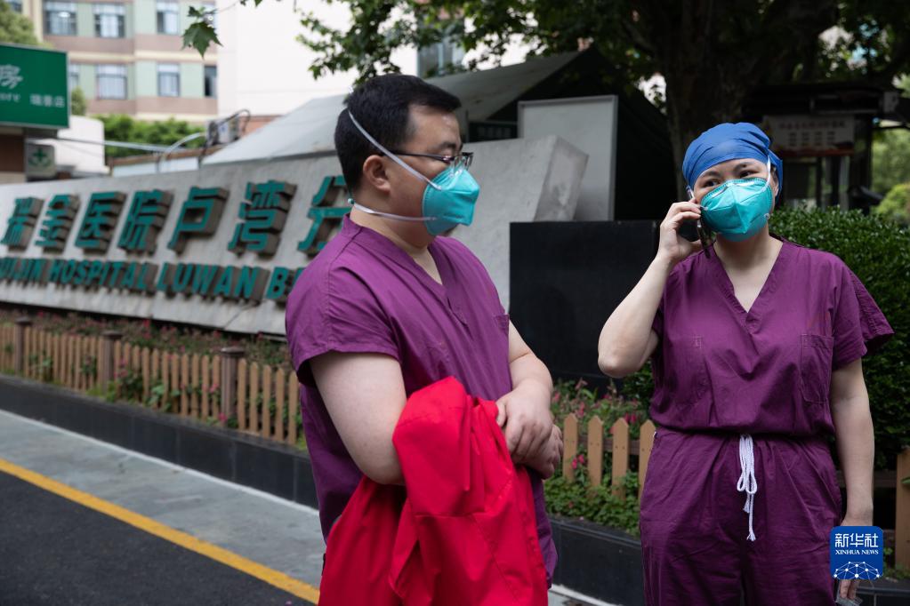 5月10日,在上海市黄浦区瑞金医院卢湾分院,刘纯(右)和同事交流工作情况。