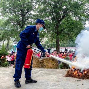 5月11日,在河北省邢台市第二十八中学,消防员在给学生讲解消防知识。