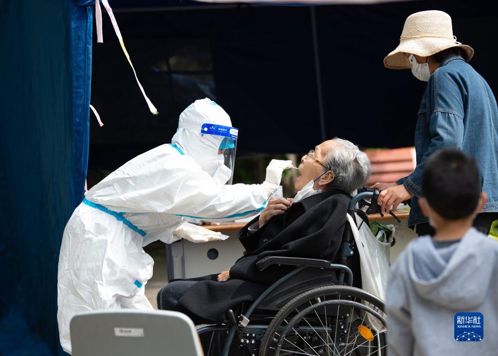 5月11日,在东城区南馆公园采样点,北京市第六医院呼吸科护士长王杨为一名坐轮椅的老人采样。