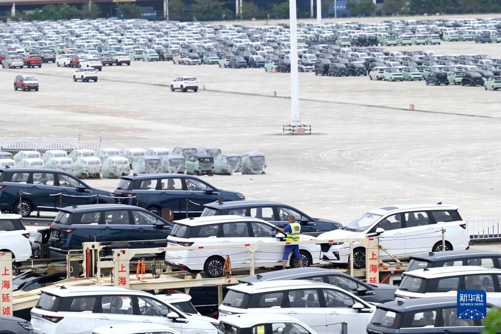 5月11日,在广西柳州汽车城一家商品车物流基地,工人把即将外运的商品车装上货车。