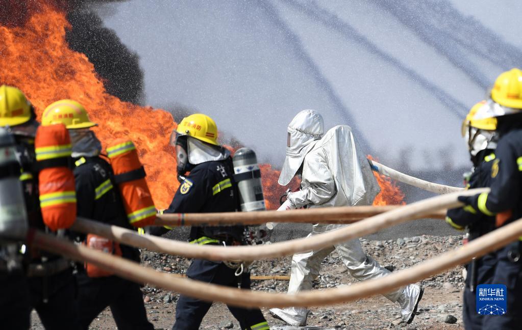 5月11日,参演人员在甘肃省张掖市甘州区演习现场开展灭火演练。