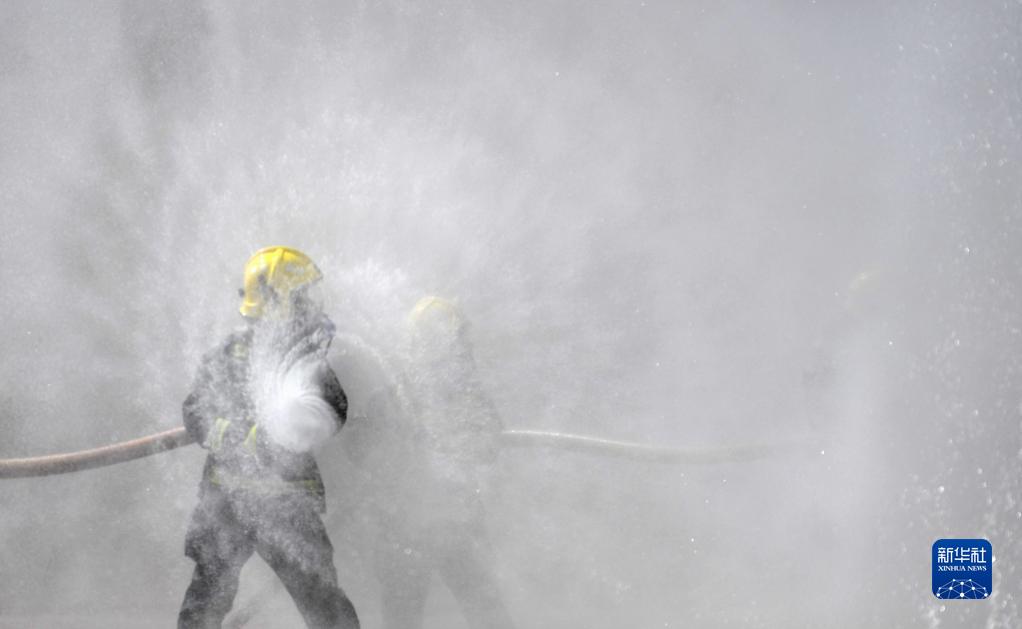 5月11日,参演人员在甘肃省张掖市甘州区演习现场开展灭火演练。
