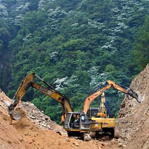 在融水苗族自治县杆洞乡花孖村,工人在公路建设现场施工(5月11日摄)。