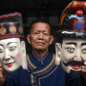 在广西环江毛南族自治县下南乡南昌屯,70岁的毛南族老人谭建新坐在傩面堆里,制作毛南族傩面,传承祖辈的非遗文化。