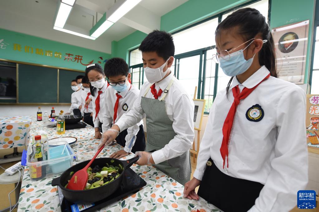 5月11日,合肥市方桥小学的学生在劳动实践课上学习烹饪技能。