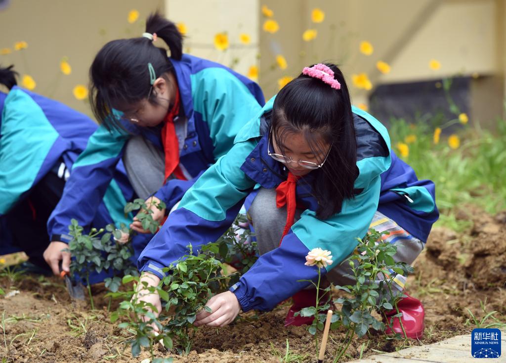 5月11日,合肥市一六八玫瑰园学校东校区的学生在劳动课上学习种植技能。