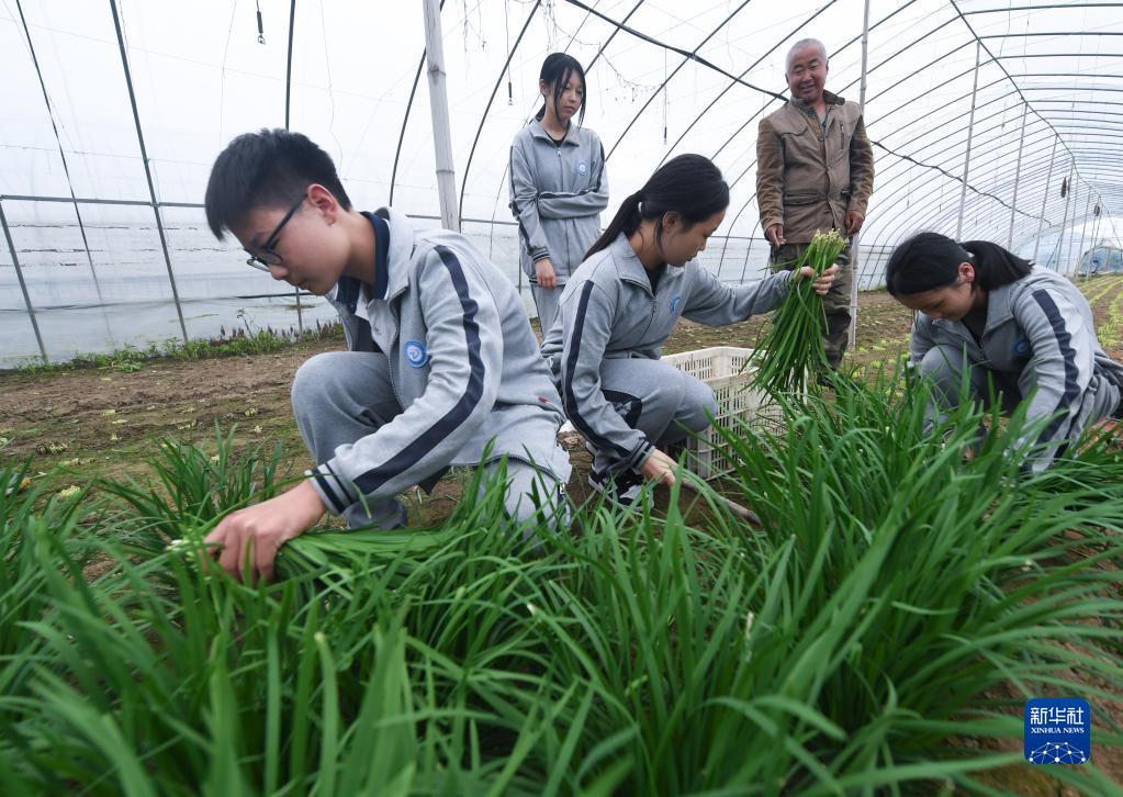 5月12日,东林镇东林中学初二年级学生在种植户的指导下学习收割韭菜。