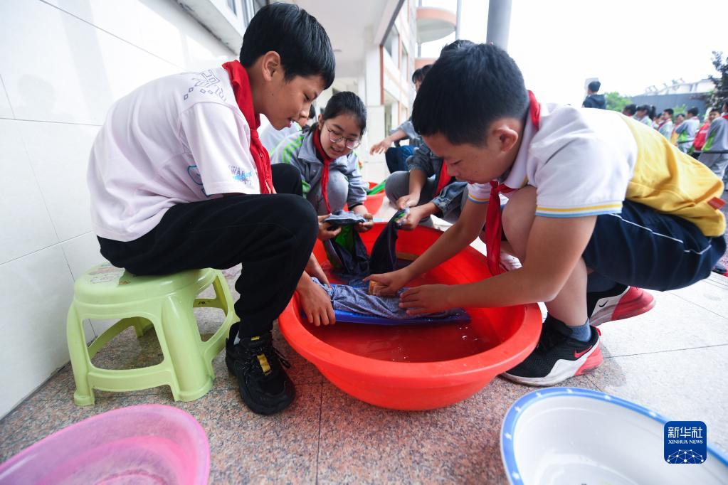 5月12日,东林镇第二小学的学生在劳动实践课上学习洗衣服。