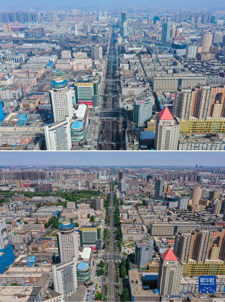 拼版照片:上图为3月24日拍摄的长春市城区景象(无人机照片,新华社发);下图为5月12日拍摄的长春市城区景象(无人机照片,新华社记者张楠摄)。