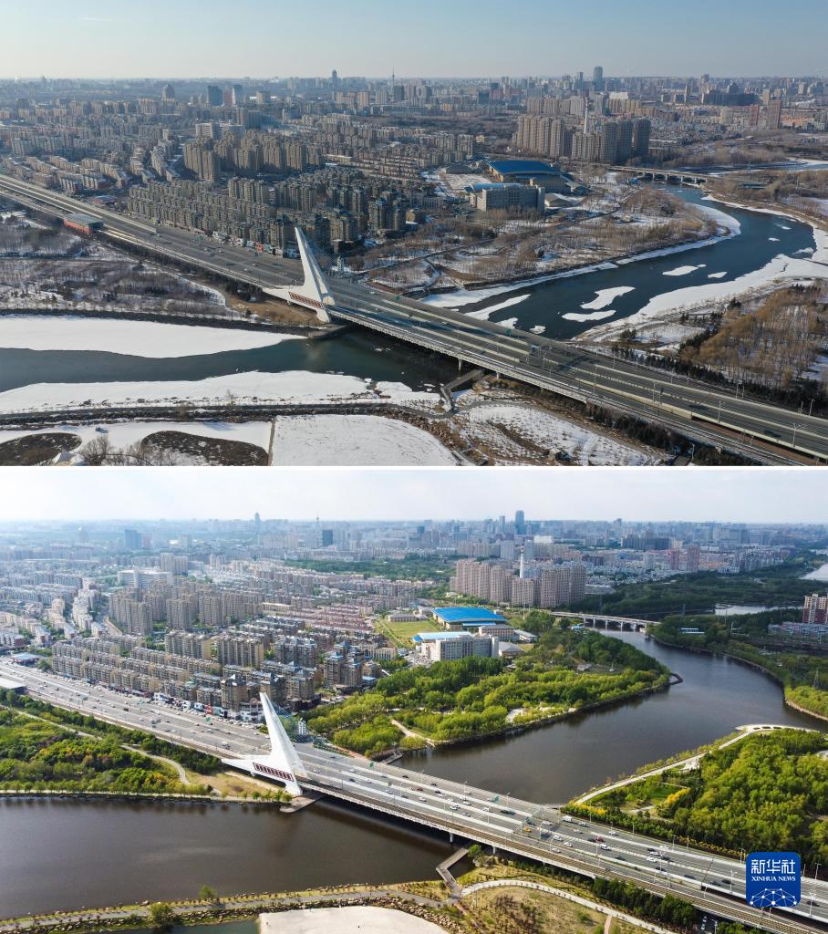 拼版照片:上图为3月20日拍摄的长春市城区景象(无人机照片,新华社发);下图为5月11日拍摄的长春市城区景象(无人机照片,新华社记者许畅摄)。