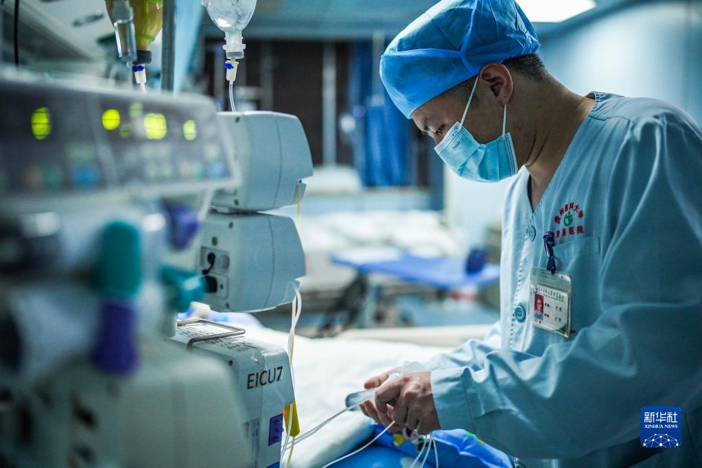 贵州医科大学附属医院急诊ICU护士邱健在梳理输液管路(5月11日摄)。