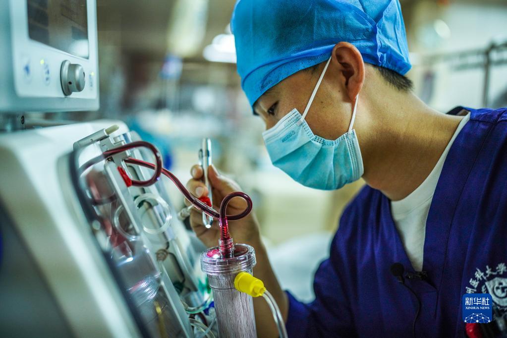 贵州医科大学附属医院综合ICU护士王银检查医疗仪器的管路(5月10日摄)。