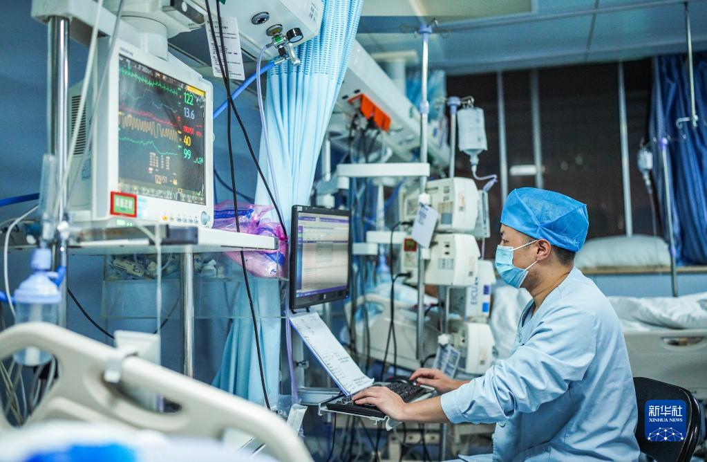 贵州医科大学附属医院急诊ICU护士邱健在病房内录入护理记录(5月11日摄)。