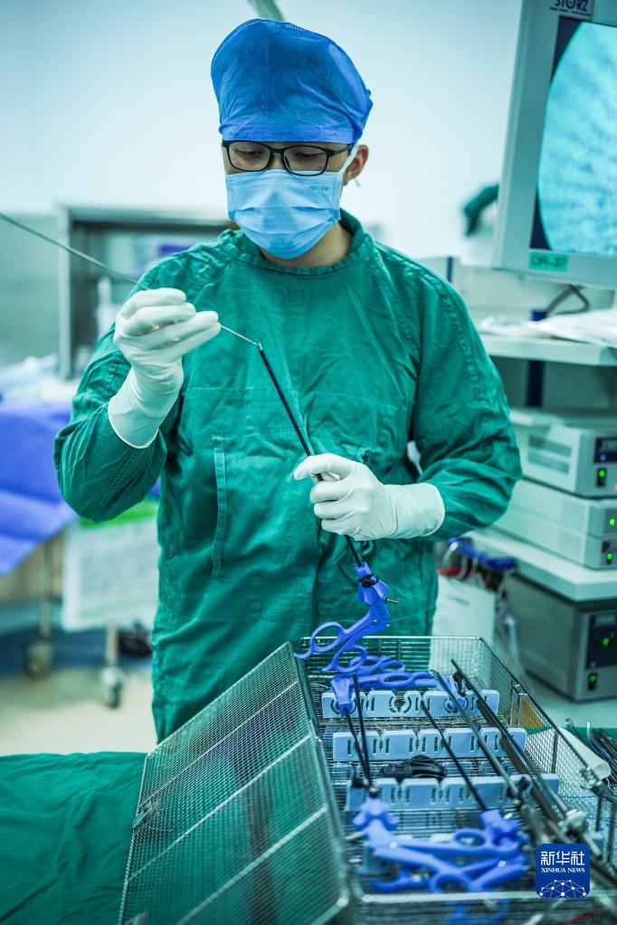贵州医科大学附属医院手术室护士张菓在组装腹腔镜器械(5月10日摄)。