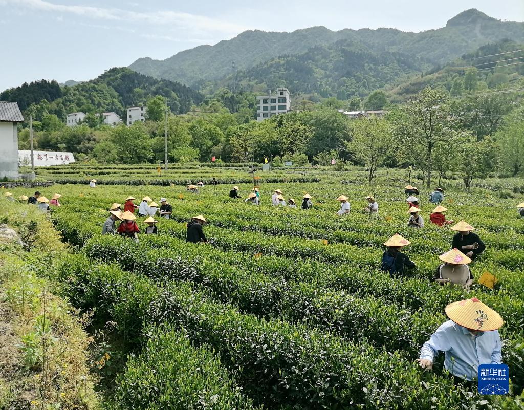 游客在位于大湾村的金寨县蝠牌茶旅有限公司茶园体验茶叶采摘(2021年5月2日摄)。
