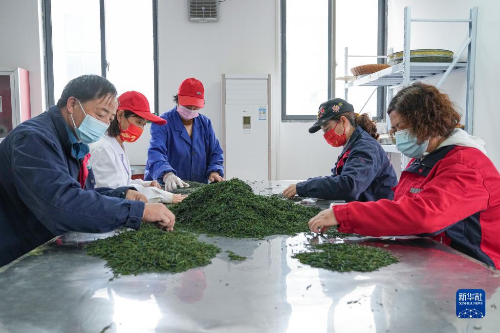 5月11日,工人在位于大湾村的金寨县蝠牌茶旅有限公司分拣茶叶。